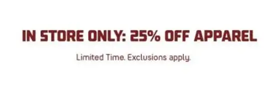 Shop in store today and get 25% off apparel for a limited time.