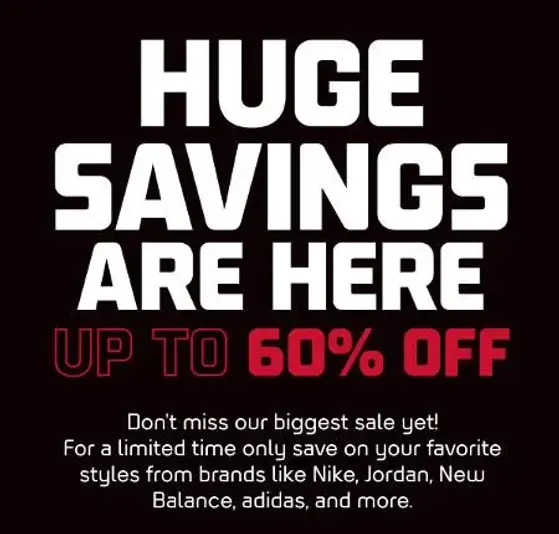 Don't miss our biggest sale yet! Shop in store and get up to 60% off on your favorite styles from brands like Nike, Jordan, New Balance, adidas, and more.